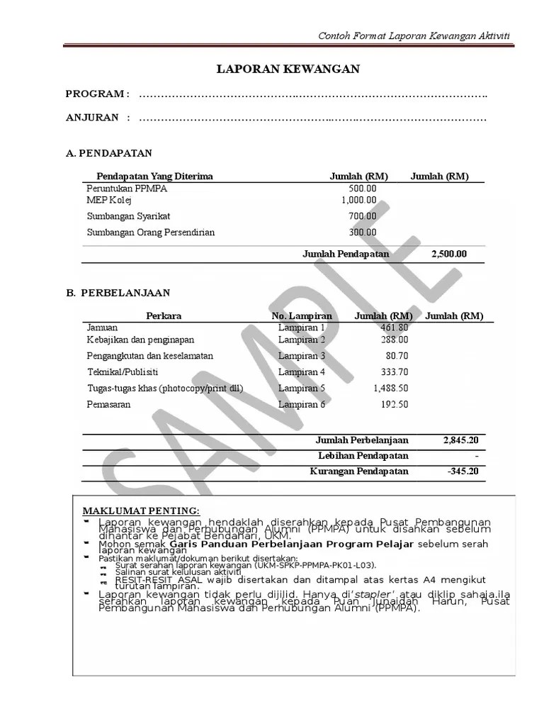 3.0 selepas apabila berakhirnya program seminar tersebut, tugasan seterusnya adalah untuk menutup akaun dan membuat laporan kewangan . (30 hari) selepas tamat program. 10 mei 2014 tempat : Borang penyata kewangan kelab 2013. Contoh laporan penyata kewangan ~. Laporan kewangan pibg sttj 2018. Pendapatan pendapatan yang diterima peruntukan ppmpa. Maahad tahfiz anak yatim darul . (sila nyatakan laporan pendapatan dan perbelanjaan sebenar program. Saya sahkan penyata kewangan akaun pendapatan dan perbelanjaan yang telah disediakan ini menunjukkan gambaran sebenar .
